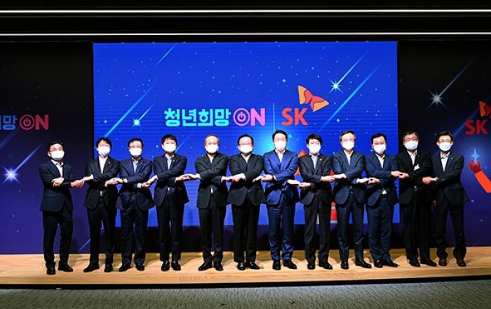 정부와 SK그룹이 ‘청년희망 ON(溫, On-Going)’ 프로젝트 네 번째 파트너십을 체결하고 향후 3년 동안 총 2만 7000개 청년 일자리를 창출하기로 했다. 국무조정실은 25일 경기도 이천의 ‘SK 하이닉스’에서 김부겸 국무총리와 최태원 SK그룹 회장 등이 참