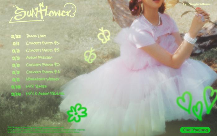 그룹 위키미키(Weki Meki)의 최유정이 본격적인 솔로 데뷔 카운트다운을 시작했다. 오는 9월 14일 솔로 데뷔를 앞둔 최유정은 30일 오후 2시 소속사 공식 SNS를 통해 첫 번째 싱글 앨범 ‘Sunflower'(선플라워)의 스케줄러를 공개했다. 스케줄러에 따