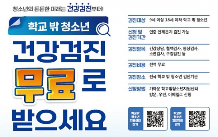 여성가족부는 국민건강보험공단·전국 학교밖청소년지원센터(이하 꿈드림센터)와 함께 다음 달 1일부터 오는 11월 30일까지 ‘학교 밖 청소년 건강검진 집중홍보 캠페인’을 실시한다고 29일 밝혔다. 여가부는 더 많은 학교 밖 청소년들이 건강검진에 참여할 수 있도록