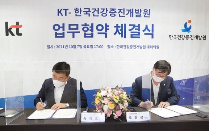 KT가 한국건강증진개발원과 서울 중구 한국건강증진개발원 사옥에서 ‘디지털 헬스케어 환경 조성을 위한 업무협약’을 체결했다고 8일 밝혔다. 이번 MOU를 통해 양사는 ▲어르신 전용 ‘오늘건강’ 앱과 IoT 디바이스의 연동 지원 ▲건강관리를 위한 디지털 헬스케