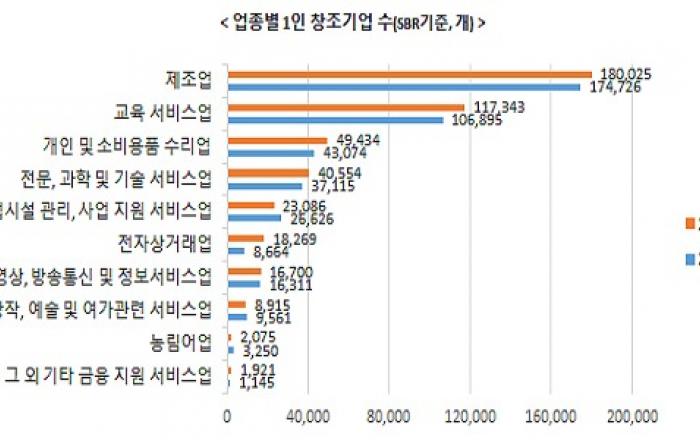 2019년 기준 국내 1인 창조기업은 총 45만 8322곳으로 전년보다 7.2% 늘어난 것으로 나타났다.또 온라인 기반 업종 증가 등에 힘입어 창의성·전문성을 갖춘 1인 창조기업 수는 2017년부터 3년 연속 증가세를 기록한 것으로 조사됐다.중소벤처기업부는 이