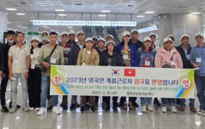 경남 합천군은 지난 10일 농촌 인력난 해소를 위해 시행하고 있는 2023년 상반기 외국인 계절근로자 프로그램으로 배정된 외국인 계절근로자 인원 140명 중 27명이 먼저 입국했다고 13일 밝혔다. 외국인 계절근로자 프로그램은 결혼이민자의 4촌 이내 친척을 단기간