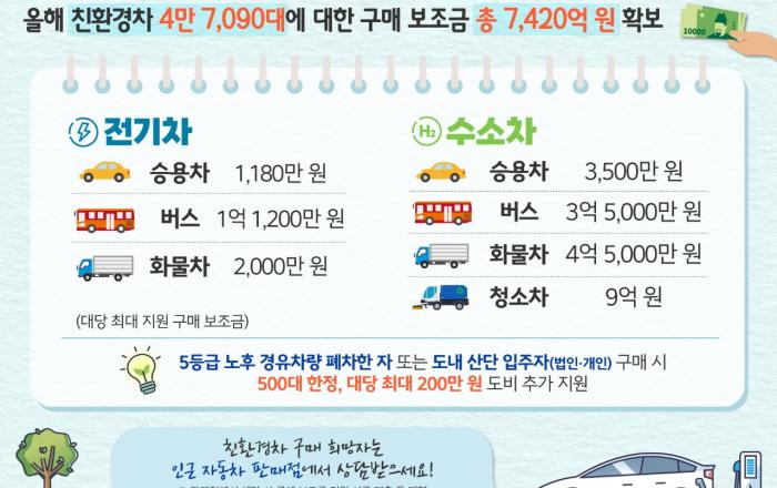 경기도가 올해 전기차 등 친환경차 구매보조금으로 총 7,420억 원을 지원한다고 14일 밝혔다. 지난해 보급 물량 3만 3,046대 대비 1.5배 가까이 늘어난 4만 7,090대에 대한 지원이 가능한 금액이다. 우선 전기차의 경우 승용차 3