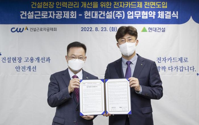 현대건설과 건설근로공제회(이하 공제회)는 23일(火), ‘건설근로자 편의와 현장 인력관리 개선을 위한 건설근로자 전자카드제 전면 도입 업무협약(MOU)’을 체결했다.서울시 중구에 위치한 건설근로공제회에서 열린 이날 서명식은 현대건설 추영기 안전사업지원실장과 공제회 송문