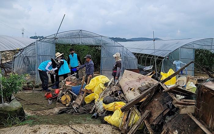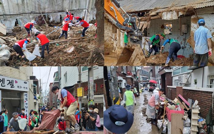 집중호우로 인한 피해 현장의 복구 활동이 한창인 가운데 전국에서 모인 자원봉사자의 손길로 일상회복이 빨라지고 있다. 행정안전부는 지난 10일부터 18일까지 서울·인천·경기·강원·전북·충남 등 6개 시·도의 54개 자원봉사센터를 통해 1만 9000여 명의 자원봉사자