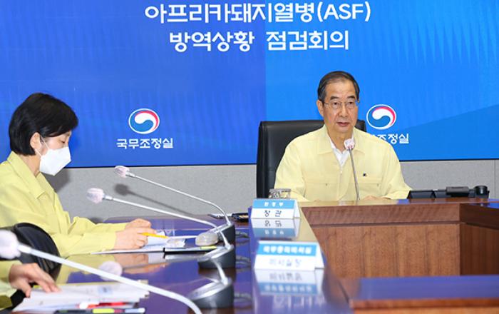 한덕수 국무총리는 19일 아프리카돼지열병(ASF)과 관련 “추석 연휴에 아프리카돼지열병이 확산하지 않도록 관계부처와 지방자치단체는 귀성객의 농장 방문 자제 등을 적극적으로 홍보해달라”고 당부했다. 한 총리는 이날 서울 세종로 정부서울청사에서 열린 ‘ASF 방역상황