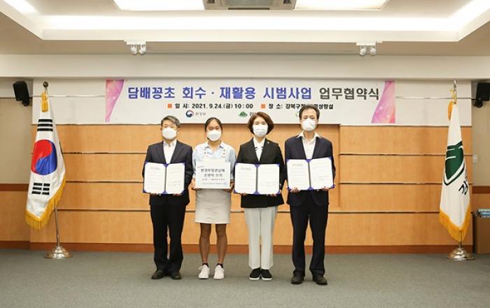 담배꽁초에서 플라스틱 필터를 분리해 재활용하는 시범사업이 추진된다.환경부는 24일 서울 강북구, 한국순환자원유통지원센터와 담배꽁초 회수·재활용 체계 구축을 위한 업무협약을 체결했다고 밝혔다.▲ 한정애 환경부장관이 24일 서울 강북구청에서 개최된 ‘담배꽁초 회수·재활용
