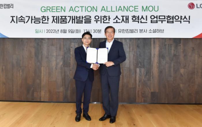 LG화학은 유한킴벌리 본사에서 LG화학 신학철 부회장과 유한킴벌리 진재승 대표이사가 참석한 가운데 ‘지속 가능한 제품 개발을 위한 소재 혁신 업무 협약(MOU), 그린 액션 얼라이언스(Green Action Alliance)’를 체결했다고 10일 밝혔다. 이번