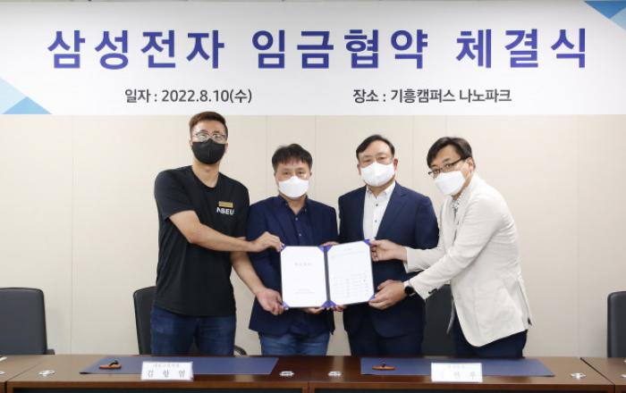 삼성전자는 노동조합 공동교섭단과 2021·2022년 임금 협약을 체결했다고 10일 밝혔다. 삼성전자와 노동조합 공동교섭단은 10일 기흥캠퍼스 나노파크에서 최완우 DS부문 인사팀장(부사장), 신인철 삼성전자 교섭대표(상무), 삼성전자노동조합 공동교섭단 김항열 위