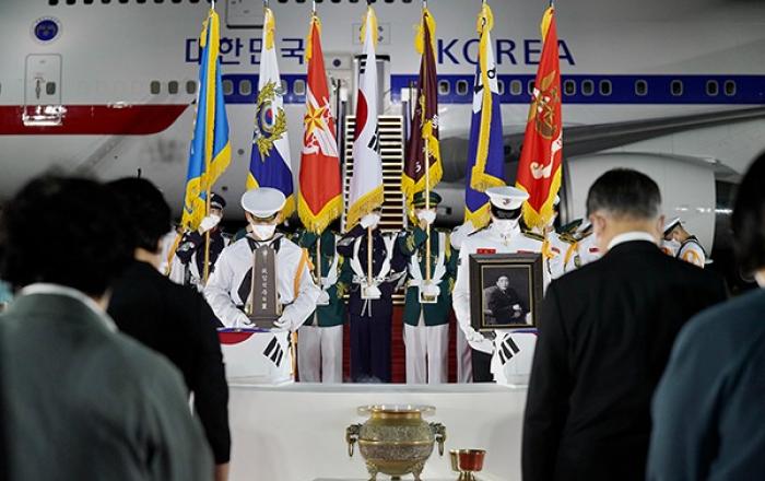 문재인 대통령과 함께 미국 하와이 호놀룰루를 출발한 6·25 전쟁 국군 전사자 유해 68구가 23일 밤 그리던 고국 땅을 밟았다.정부는 23일 밤 9시 30분 서울공항에서 문 대통령이 참석한 가운데 ‘대한민국의 이름으로 당신을 기억하겠습니다’라는 주제로 ‘국군 전사자