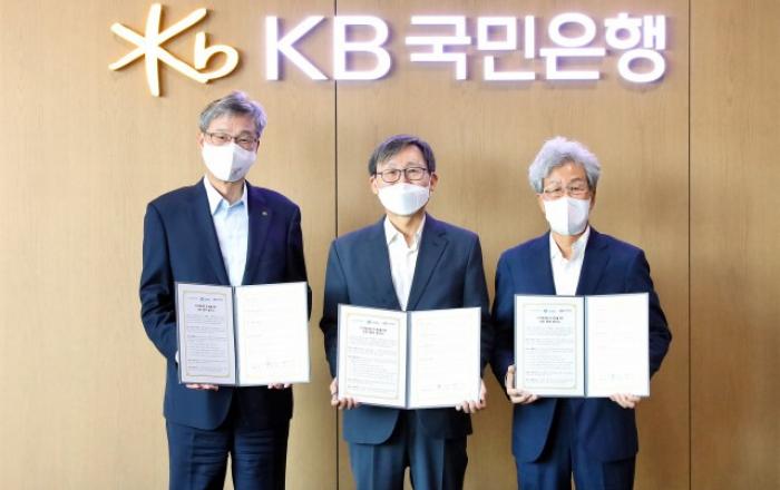 KB국민은행은 15일 수소융합얼라이언스와 엔지니어링공제조합과 함께 ‘수소경제 발전 및 육성을 위한 업무 협약’을 체결했다고 16일 밝혔다.이날 KB국민은행 여의도 본점에서 열린 협약식에는 허인 KB국민은행장, 문재도 수소융합얼라이언스 회장, 김수보 엔지니어링공제조합 이