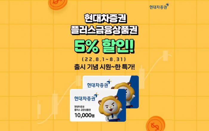 현대차증권이 주식, 펀드 등을 살 수 있는 ‘플러스금융상품권’ 출시를 기념해 할인 이벤트를 진행한다.현대차증권은 이달 1일부터 31일까지 온라인 쇼핑몰 11번가에서 ‘플러스금융상품권’을 구매하는 고객에게 5% 할인 혜택을 제공한다고 1일 밝혔다. 고객이 직접 구매하여