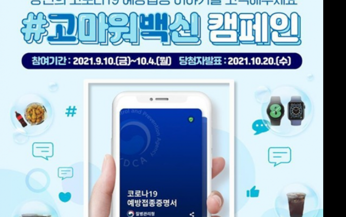 코로나19 예방접종 대응 추진단이 코로나19 예방접종 인증과 소감을 선정하는 ‘#고마워백신’ 온라인 캠페인을 오는10일부터 10월 4일까지 진행한다.이번 캠페인에 대해 추진단은 코로나19 예방접종에 동참해 주신 국민들께 고마움을 전하고, 건강한 일상으로 나아가고 싶다는