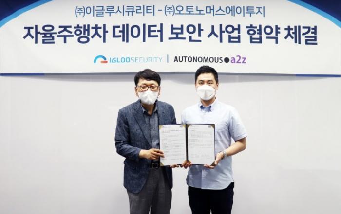 이글루시큐리티가 오토노머스에이투지와 손잡고 자율주행 보안 관제 시스템 개발에 힘을 싣는다.인공지능(AI) 기반 정보보호 선도 기업 이글루시큐리티는 자율주행 솔루션 개발 기업 오토노머스에이투지와 ‘자율주행차량 데이터 보안 사업 협력을 위한 양해각서(MOU)’를 체결했다고