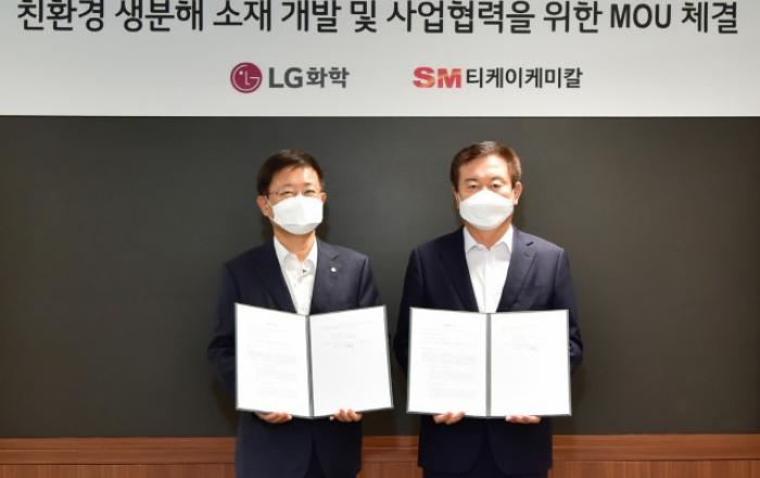 LG화학이 티케이케미칼과 손잡고 생분해 플라스틱 생산에 나선다.LG화학은 10일 여의도 LG트윈타워에서 삼라마이다스(SM)그룹의 자회사인 티케이케미칼과 ‘친환경 생분해 소재(PBAT) 개발 및 사업협력을 위한 MOU’를 체결했다고 12일 밝혔다.PBAT (Poly Bu