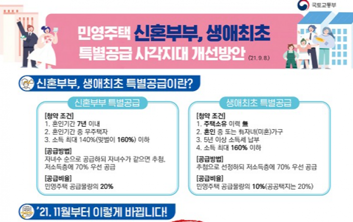 청약 기회가 제한된 청년층을 위해 민영주택 특별공급에 추첨제가 도입된다.국토교통부는 지난달 26일 열린 청년특별대책 당정협의회의 후속 조치의 일환으로 현행 생애최초·신혼부부 특별공급 제도를 일부 개편한다고 8일 밝혔다.이번 제도 개선안은 1인 가구, 맞벌이 등