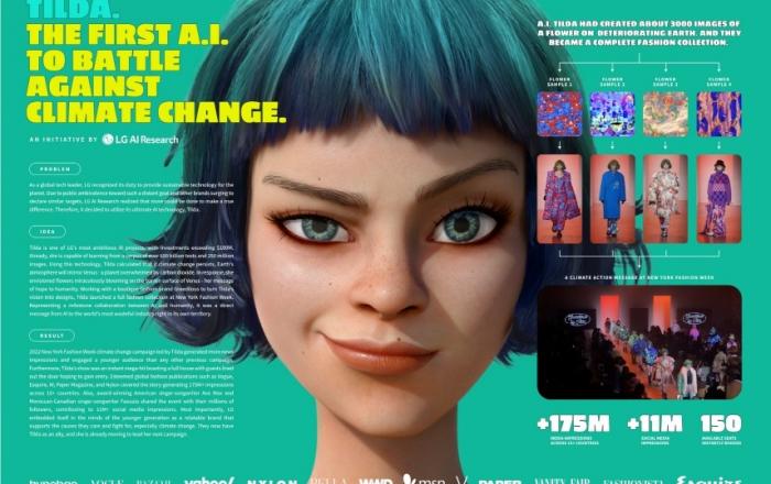 LG의 AI 아티스트 ‘틸다(Tilda)’가 뉴욕 현지시간 지난 15일 ‘2022 뉴욕 페스티벌(New York Festivals International Advertising Awards)’에서 ‘The Future Now’ 부문 금상과 은상을 동시에 수상하는 영예를