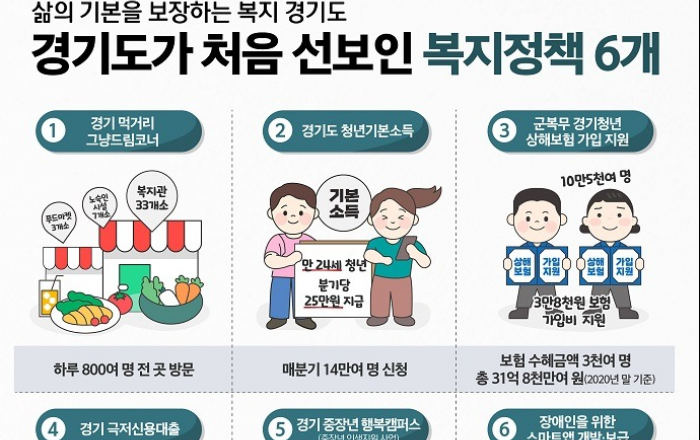 경기도가 ‘삶의 기본을 보장하는 복지 경기도’를 위해 각종 정책을 시행하고 있으며, 이 중 6개가 전국 최초로 추진한 정책이라고 1일 밝혔다.지난해 12월 개소한 ‘경기 먹거리 그냥드림 코너’가 대표적이다. 도민 누구나 성남‧평택‧광명 등 푸드마켓 3개소, 복지관 33
