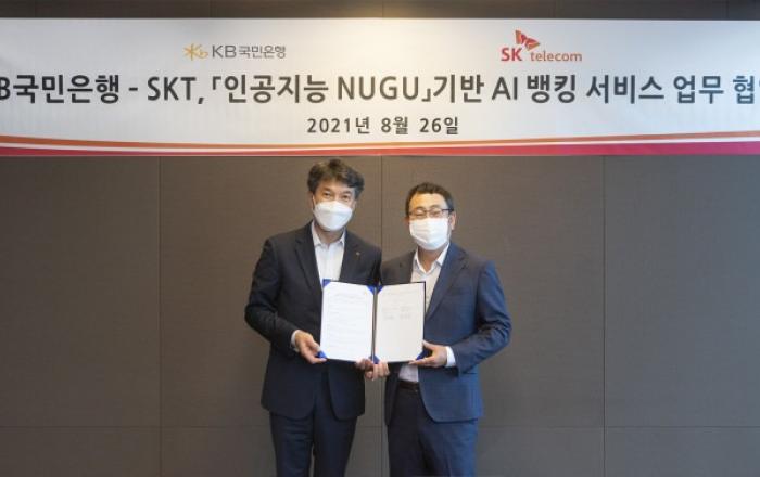 KB국민은행은 26일 AI 뱅킹 서비스 개발을 위한 업무협약을 체결했다고 밝혔다. 이번 협약을 통해 KB국민은행은 SK텔레콤의 누구(NUGU)를 기반으로 리브(Liiv)를 고도화할 예정이다.이날 SK텔레콤 본사에서 열린 협약식에는 성채현 KB국민은행 개인고객그룹 대표,