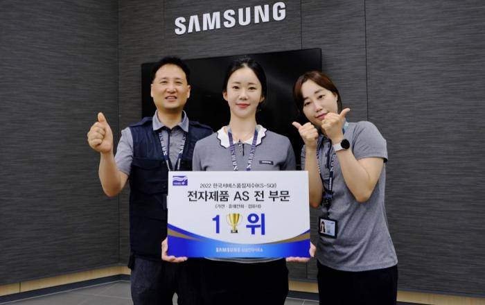 삼성전자서비스가 30일 한국표준협회가 발표한 ‘2022 한국서비스품질지수 (KS-SQI)’에서 작년에 이어 올해도 가전, 휴대전화, 컴퓨터 AS 품질 전 부문 1위를 석권했다. 전자제품 AS 부문별 조사가 시작된 이래 컴퓨터 21년 연속, 휴대전화 19년