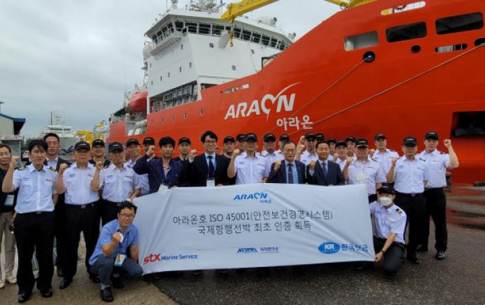 STX마린서비스에서 관리 중인 극지연구소 소속 국내 유일의 쇄빙연구선 ‘아라온호’가 6월 22일(수) 국제항행선박 최초로 국제적 인증기관인 한국선급으로부터 안전보건 분야의 국제 표준인 ISO45001(안전보건경영시스템) 인증을 획득했다. 아라온호가 이번에 인증을