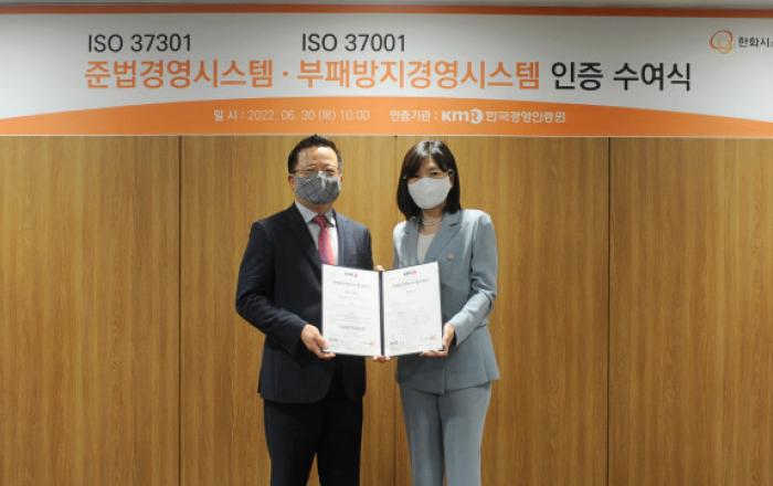 한화시스템이 국제 표준화 기구(ISO)에서 제정한 ‘준법경영시스템(ISO 37301)’과 ‘부패방지경영시스템(ISO 37001)’ 국제 인증을 동시에 획득하며 글로벌 수준의 투명경영을 인정받았다고 1일 밝혔다. 6월 30일 한화시스템 서울사업장(서울 중구 장교
