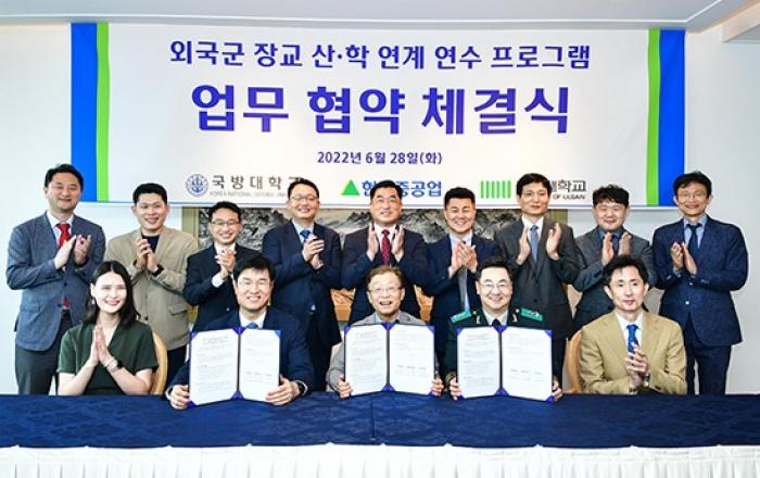 현대중공업이 국내 대학들과 손잡고, 방위산업 해외 경쟁력을 높이는 산학연수 프로그램을 운영합니다.현대중공업은 지난 28일(화) 울산 본사에서 이상균 사장, 국방대학교 정해일 총장, 울산대학교 오연천 총장 등이 참석한 가운데, 국방대학교 및 울산대학교와 ‘외국군 장교 산