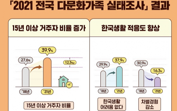 여성가족부는 전국 다문화가족 1만 5578가구를 대상으로 실시한 ‘2021년 전국 다문화가족 실태조사’ 결과를 27일 발표했다. 이번 조사는 ‘다문화가족지원법’ 제4조에 따라 다문화가족에 대한 기초자료를 수집해 중장기 지원정책 수립에 활용하기 위해 2009년부터