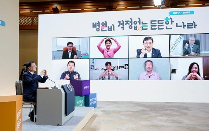 문재인 대통령은 12일 건강보험 보장성 강화(‘문재인 케어’)의 지난 4년에 대해 “개인 질환뿐 아니라 코로나 예방과 진단, 치료비용부터 야간 간호료와 의료인력 지원 비용에 이르기까지 감염병과 연관되는 모든 분야에서 신속하고 적절하게 대응할 수 있었다”며 “건강보험이