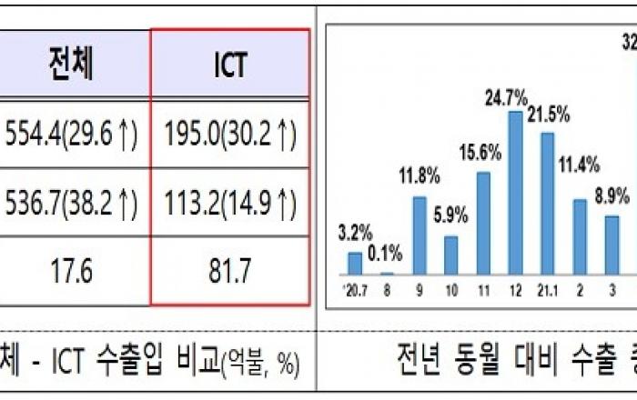 지난달 정보통신기술(ICT) 수출액은 195억 달러로 역대 7월 수출액 중 최대치를 기록했다.또 지난해 6월 이후 14개월 연속 증가세, 4개월 연속 두 자리 증가한 실적을 보였다. 일평균 수출도 8억 달러로 32.9% 증가해 이 또한 역대 7월 일평균 수출액 중 1위