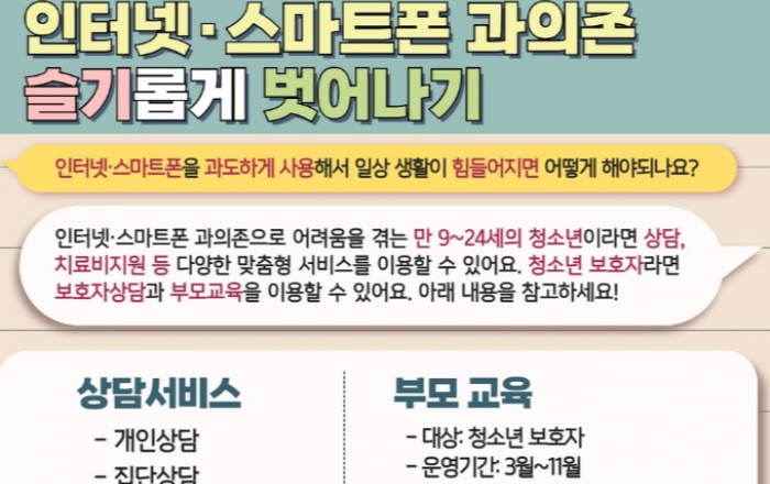 경기도가 경기도청소년상담복지센터와 함께 9세~24세의 인터넷‧스마트폰 과의존 청소년과 보호자를 대상으로 상담, 치료비 지원, 부모교육 등 다양한 맞춤형 서비스를 제공한다고 27일 밝혔다. 먼저 도는 경기도교육청과 협력해 학령전환기 초4, 중1, 고1