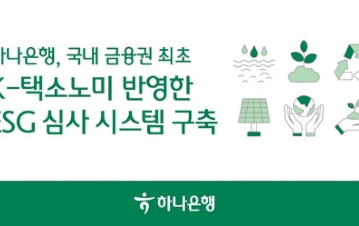 하나은행은 국내 금융권 최초로 K-택소노미(K-Taxonomy, 한국형 녹색분류체계)를 반영한 'ESG 금융 심사 시스템'을 구축했다고 밝혔다. 한국형 녹색분류체계 'K-택소노미'는 온실가스 감축, 기후변화 적응 등 친환경 경제활동을 분류하는 환경부 기준으로, 녹색