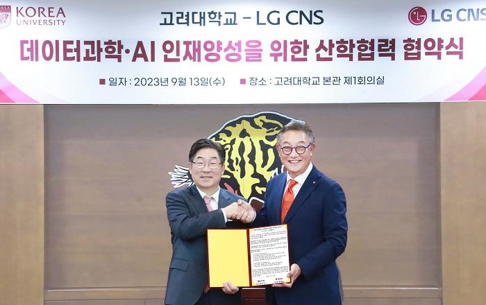 DX전문기업 LG CNS가 고려대학교 대학원 과정에 ‘채용 연계형 계약학과’를 신설하고, 데이터과학·AI 융합인재 육성에 나선다. LG CNS는 고려대와 13일 서울 성북구 안암동 대학 본관에서 ‘데이터과학·AI 인재양성을 위한 산학협력 업무협약(M