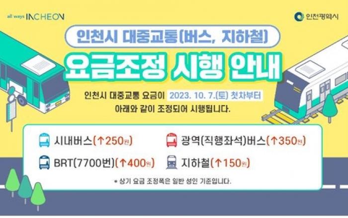 인천 지하철·버스 요금이 8년 만에 인상된다. 인천광역시(시장 유정복)는 오는 10월 7일(토) 첫차부터 인천 지하철과 버스 요금이 각각 150원, 250원 인상된다고 밝혔다. 섬 주민들의 여객선 운임도 버스 요금과 동일하게 오른다. 이에 따르면 성인의 신용카