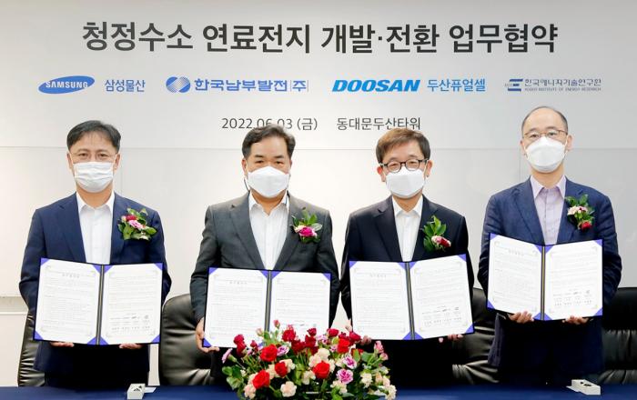 두산퓨얼셀이 청정수소 연료전지로의 전환을 위해 초격차 기술경쟁력 확보에 나섰다.두산퓨얼셀은 3일, 동대문 두산타워에서 한국남부발전, 삼성물산 건설부문, 한국에너지기술연구원(이하 에너지연)과 ‘청정수소 연료전지 개발·전환’을 위한 업무협약(MOU)을 체결했다고 밝혔다.이