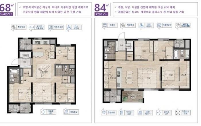 LH는 올해부터 통합공공임대주택 사업이 본격화됨에 따라 생애주기별 맞춤형 주택 공급을 위해 중형 평형을 포함한 통합공공임대주택 세대 평면 21개종을 개발했다고 밝혔다.소형 주택의 경우, 1~2인 가구의 개성 있는 라이프 스타일에 대응하기 위해 평면을 다양화하고, 3~4