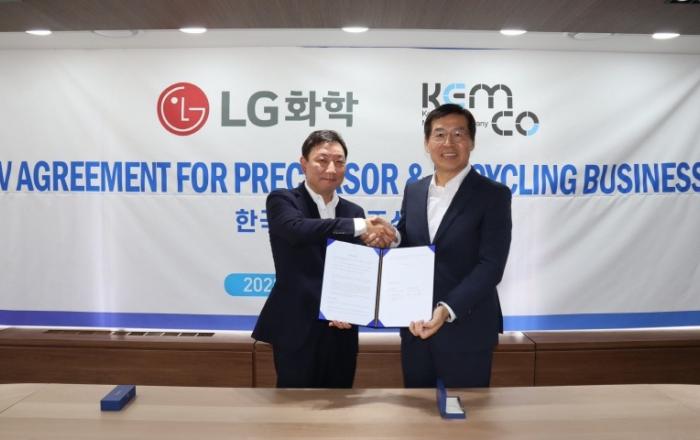 LG화학이 배터리 소재의 밸류 체인 강화를 위해 고려아연의 계열사인 켐코(KEMCO)와 리사이클 및 전구체 합작법인을 설립한다.LG화학은 서울 논현동 고려아연 본사에서 켐코와 합작법인 설립 계약을 체결했다고 2일 밝혔다. 지난달 31일 열린 체결식에는 LG화학 신학철