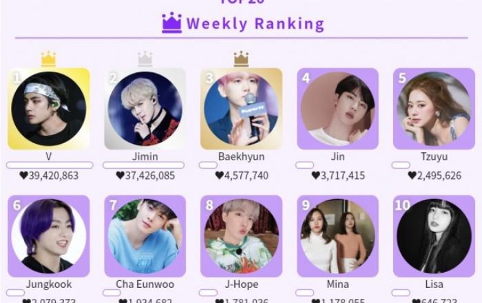 방탄소년단(BTS) 뷔가 글로벌 K팝 아이돌 인기투표 서비스 앱 ‘케이돌(KDOL)’에서 7월 셋째 주 가장 많은 하트를 받아 주간 랭킹 1위에 올랐다.케이돌은 K팝 아이돌을 대상으로 하는 실시간 투표를 집계, 매일 한국 시각 자정에 리셋하며 이 순위의 누적 투표로 일