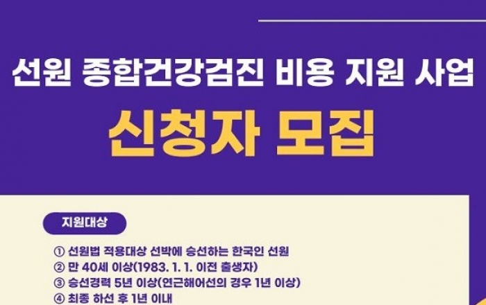 해양수산부는 올해 40세 이상 선원에게 종합건강검진비용 35만 원을 지원한다고 9일 밝혔다.선원들은 선박에 승선하는 동안 진동, 소음, 흔들림, 유해물질 등에 노출돼 있다. 먼 바다에서 생활함에 따라 의료 서비스를 받을 기회도 적다.이에 해수부는 선원들의 질환을 신속하