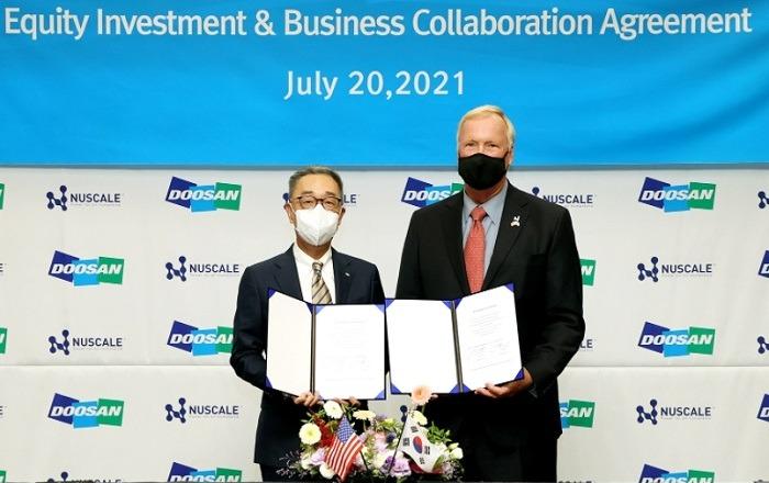 두산중공업이 소형모듈원전(이하 SMR) 공급 물량을 추가로 확보하면서 SMR 기자재 제작사업 확대를 위한 기반을 마련했다.▲ 20일 경기도 분당두산타워에서 열린 ‘지분투자 및 사업협력 협약식’에서 뉴스케일파워 존 홉킨스 회장(오른쪽)과 두산중공업 박지원 회장이 서명을