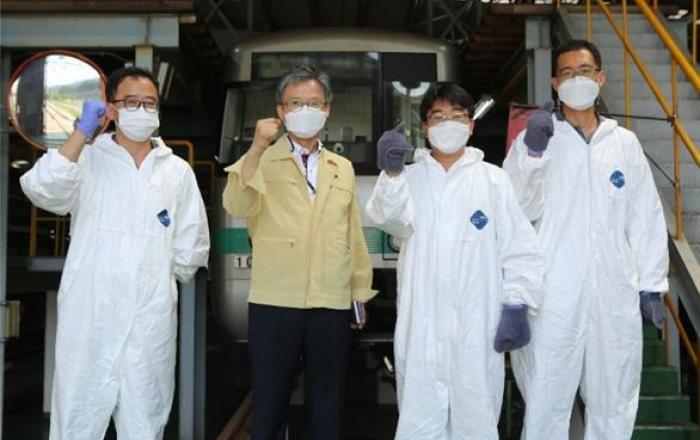 대전도시철도공사 직원들이 연일 30도가 넘는 폭염 속에서도 도시철도 안전운행 유지를 위한 방역 소독에 최선을 다하고 있다.▲ 대전도시철도공사 김경철 사장이 판암기지를 방문해 전동차 방역 작업 중인 현장 직원들을 격많은 이들이 의료진의 노고에 격려를 아끼지 않고 있지만,