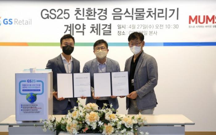GS리테일이 운영하는 편의점 GS25는 친환경 녹색 음식물처리기 전문기업 MUMS (멈스)와 함께 27일 전국 1만 6000여 GS25 편의점에 향후 5년간 친환경 미생물 액상 발효 방식의 음식물처리기를 도입하며 음식물쓰레기 ‘제로(Zero)’화 프로젝트에 앞장선다고