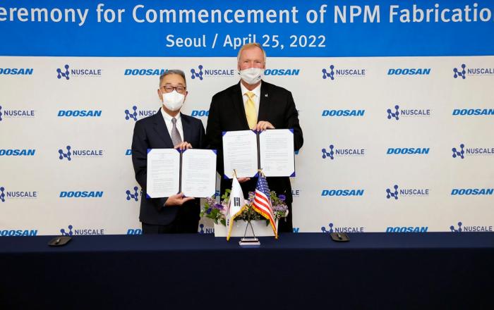 두산에너빌리티는 동대문 두산타워에서 뉴스케일파워(NuScale Power) 존 홉킨스 사장과 두산에너빌리티 박지원 회장이 참석한 가운데 소형모듈원전(이하 SMR)의 본격적인 제작 착수를 위한 협약을 체결했다고 25일 밝혔다.이번 협약으로, 2029년 준공을 목표로 뉴스