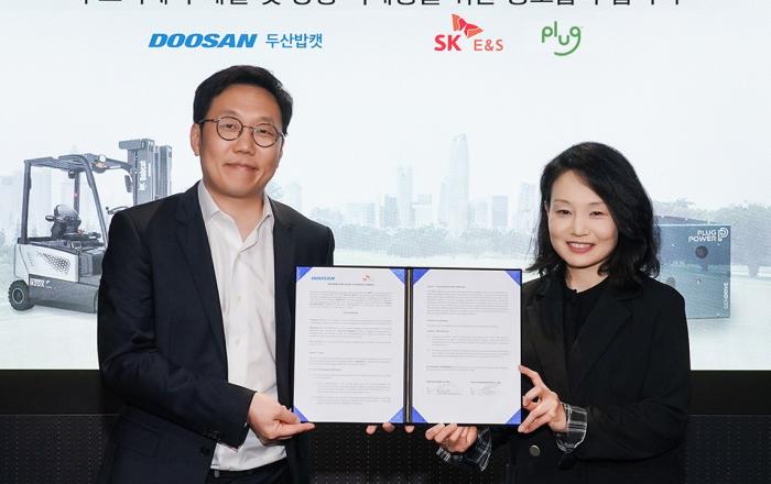 두산밥캣이 국내에서 수소 연료전지 기반의 소형장비 개발에 착수하면서 친환경 사업 분야 확장에 나선다. 두산밥캣은 경기도 성남시 분당두산타워에서 SK E&S·미국 플러그(구 플러그파워)의 합작법인과 수소 지게차 개발 상호 협력을 위한 양해각서(MOU)를 체결했다고