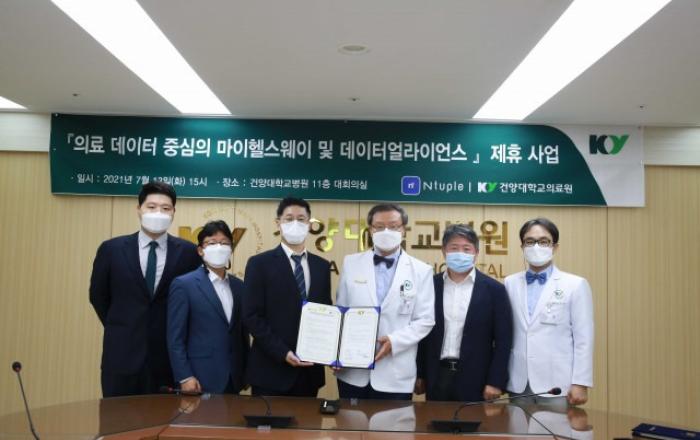 엔터플은 7월 13일 오후 3시 건양대학교병원 본관 11층 대회의실에서 건양대의료원과 ‘의료데이터 중심의 마이헬스웨이 및 데이터얼라이언스 사업’ 업무 협약(MOU)을 체결했다.▲ 엔터플이 건양대병원과 마이헬스웨이 사업 추진을 위한 협약식을 진행했다협약식에는 건양대의료원
