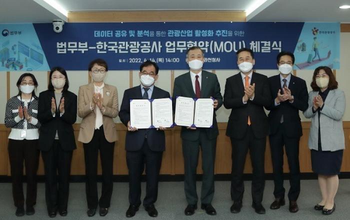 법무부와 한국관광공사는 14일 법무부 대회의실에서 관광산업 활성화를 위한 업무협약(MOU)을 체결했다고 밝혔다.이번 업무협약은 최근 코로나19 영향으로 국내 관광업계가 어려움을 겪고 있는 가운데 코로나 이후 일상 회복을 대비하고 관광산업과 지역경제 활성화를 위해 마련됐