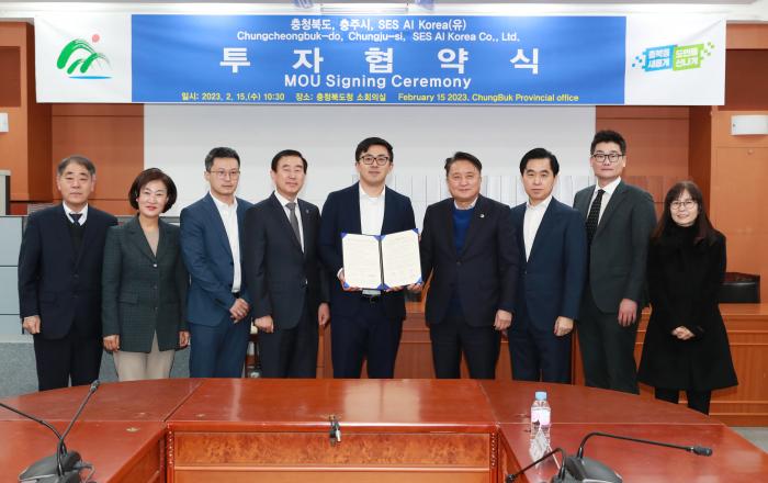 충청북도와 충주시는 15일 충북도청에서 미국 외국인투자기업 에스이에스에이아이코리아(유)(SES AI Korea Co., Ltd)와 투자협약을 체결했다. 협약식에는 김영환 도지사와 조길형 충주시장, 치차오 후 에스이에스에이아이코리아(유) 대표이사 등 관계자 10여명이