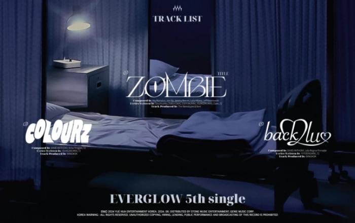 그룹 에버글로우(EVERGLOW)가 서슬 퍼런 러브송으로 돌아온다. 에버글로우(이유, 시현, 미아, 온다, 아샤, 이런)는 29일 0시 공식 SNS를 통해 다섯 번째 싱글 앨범 'ZOMBIE(좀비)'의 트랙리스트를 공개했다. 이미지에는 암전 된 입원실이 보이고 한편에