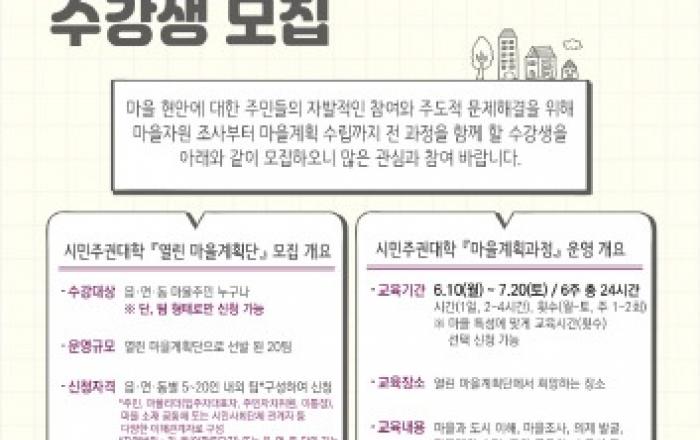 세종특별자치시가 '시민주권특별자치시 세종'의 주요 추진사업의 일환으로 마을자원 조사부터 마을계획 수립까지 전 과정을 함께할 시민주권대학 '마을계획과정' 수강생을 모집한다.이번 마을계획과정은 읍·면·동에 거주하는 시민들이 주도해 마을의 현안을 발굴하고 자원조사부터 마을계
