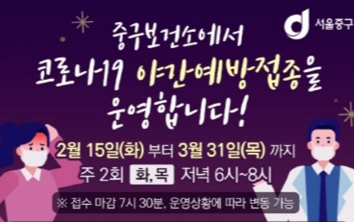 오미크론 확진자가 연일 급증하는 가운데 서울 중구가 주민들이 근로시간 이후에도 예방접종을 받을 수 있도록 코로나19 야간예방접종을 한시적으로 실시한다고 18일 밝혔다.지난 15일 시작한 야간예방접종은 내달 31일까지 중구보건소에서 매주 화요일과 목요일 저녁 6시부터 8